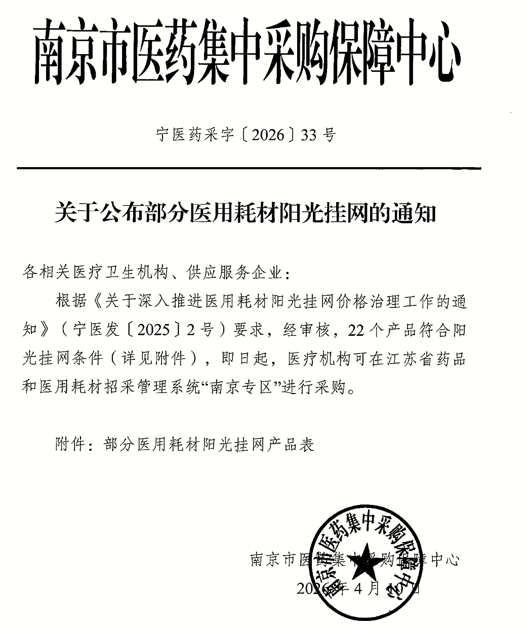根據(jù)《關(guān)于深入推進(jìn)醫(yī)用耗材陽光掛網(wǎng)價格治理工作的通知》(寧醫(yī)發(fā)〔2025 〕2號)要求,經(jīng)審核,22個產(chǎn)品符合陽光掛網(wǎng)條件(詳見附件),即日起,醫(yī)療機(jī)構(gòu)可在江蘇省藥品和醫(yī)用耗材招采管理系統(tǒng)“南京專區(qū)”進(jìn)行采購。